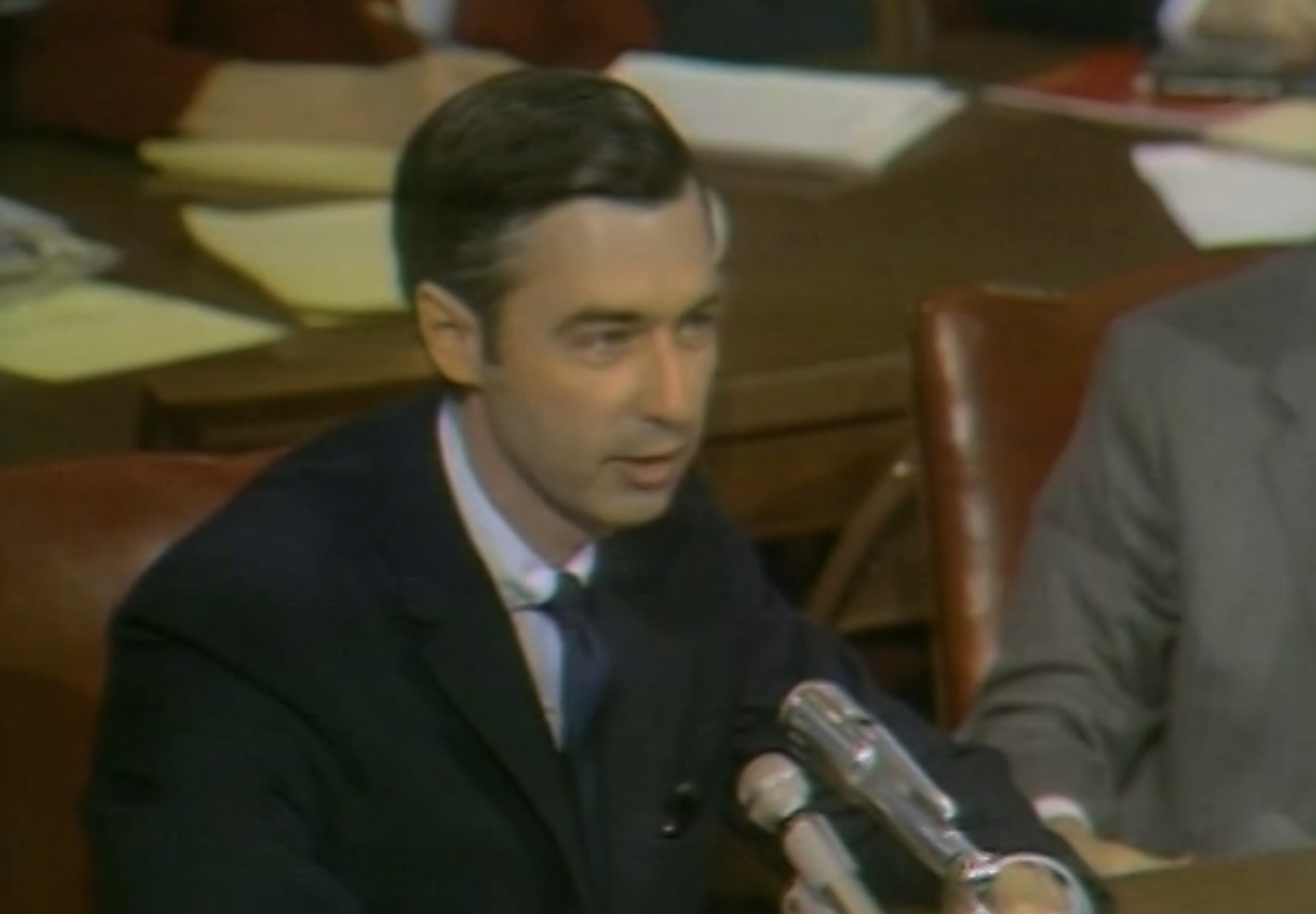 Early in his career, Fred Rogers testified before the Senate Subcommittee on Communications to explain the value of educational programming like Mister Rogers’ Neighborhood. He argued that, in contrast to “animated bombardment,” his program offers children “an expression of care.” While some of the people in the room laughed nervously during his testimony, Fred maintained a calm, even tone that emphasized how seriously he took the proceeding and its outcome. In six short minutes, he not only won over Senator John Pastore, the chair of the Subcommittee, but also secured sustained funding for public broadcasting.
